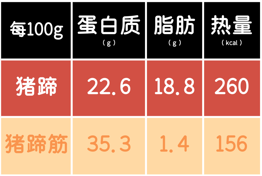 有意思的是,在《中国食物成分表》里和猪蹄挨在一起,仅差一字的“猪蹄筋”,比猪蹄胶原蛋白更多,而脂肪含量低92%,热量也低很多。