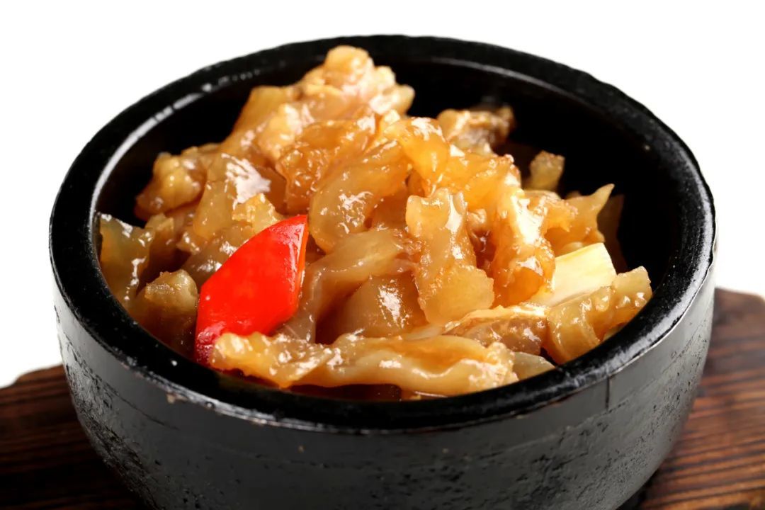 猪蹄筋是特指猪蹄中连接关节的腱子肉,主要由胶原蛋白和弹性蛋白构成。做熟之后质地柔软,也非常好吃~